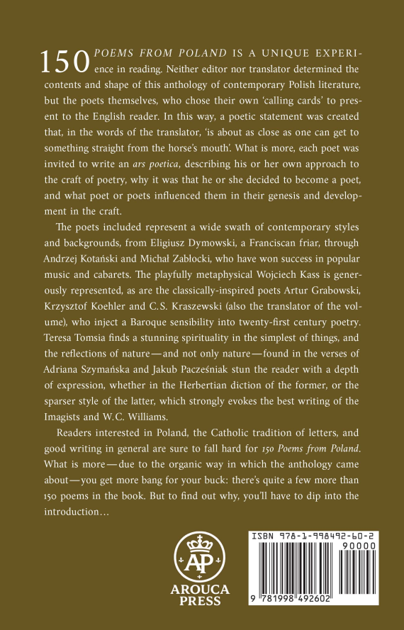 150 Poems from Poland is a unique experience in reading. Neither editor nor translator determined the contents and shape of this anthology of contemporary Polish literature, but the poets themselves, who chose their own ‘calling cards’ to present to the English reader. In this way, a poetic statement was created that, in the words of the translator, ‘is about as close as one can get to something straight from the horse’s mouth’. What is more, each poet was invited to write an ars poetica, describing his or her own approach to the craft of poetry, why it was that he or she decided to become a poet, and what poet or poets influenced them in their genesis and development in the craft.