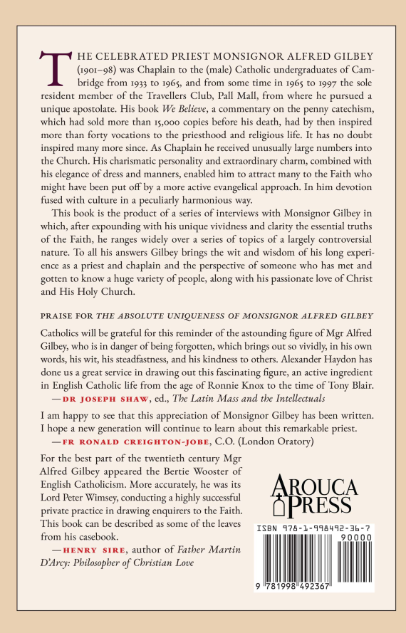 The celebrated priest Monsignor Alfred Gilbey (1901–98) was Chaplain to the (male) Catholic undergraduates of Cambridge from 1933 to 1965, and from some time in 1965 to 1997 the sole resident member of the Travellers Club, Pall Mall, from where he pursued a unique apostolate. His book We Believe, a commentary on the penny catechism, which had sold more than 15,000 copies before his death, had by then inspired more than forty vocations to the priesthood and religious life. It has no doubt inspired many more since. As Chaplain he received unusually large numbers into the Church. His charismatic personality and extraordinary charm, combined with his elegance of dress and manners, enabled him to attract many to the Faith who might have been put off by a more active evangelical approach. In him devotion fused with culture in a peculiarly harmonious way. This book is the product of a series of interviews with Monsignor Gilbey in which, after expounding with his unique vividness and clarity the essential truths of the Faith, he ranges widely over a series of topics of a largely controversial nature. To all his answers Gilbey brings the wit and wisdom of his long experience as a priest and chaplain and the perspective of someone who has met and gotten to know a huge variety of people, along with his passionate love of Christ and His Holy Church.