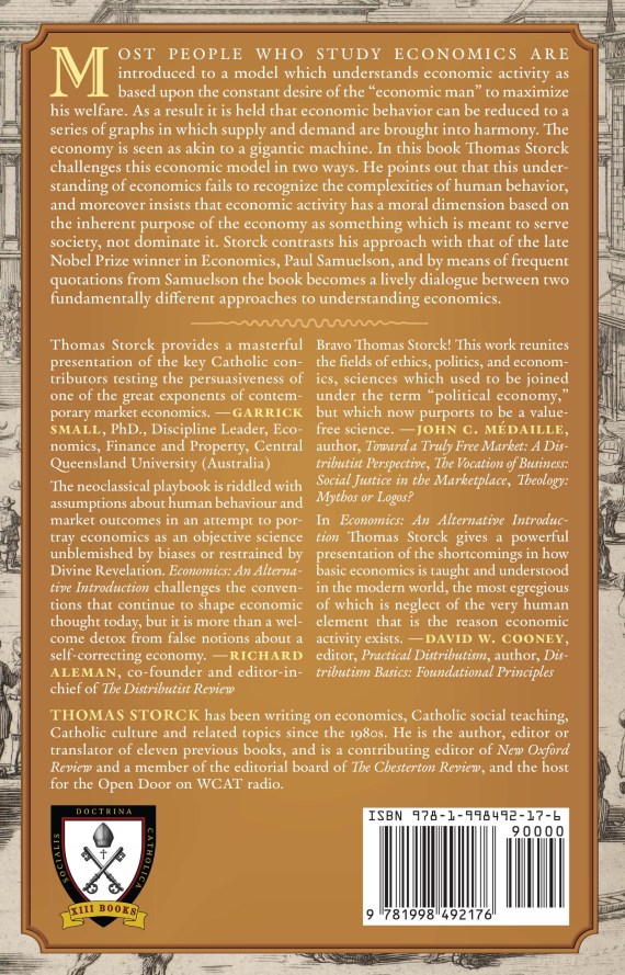 The neoclassical playbook is riddled with assumptions about human behaviour and market outcomes in an attempt to portray economics as an objective science unblemished by biases or restrained by Divine Revelation. Economics: An Alternative Introduction challenges the conventions that continue to shape economic thought today, but it is more than a welcome detox from false notions about a self-correcting economy. Firmly planted in Catholic social doctrine, Thomas Storck's book is pedagogical for young people seeking answers when their natural inclinations to grow families, buy homes, or run small businesses are stifled by the prevailing economic order. Storck's textbook serves as the starting point for the faithful wishing to reconstruct the City of God in this post-Christian age. —Richard Aleman, co-founder and editor-in-chief of The Distributist Review
