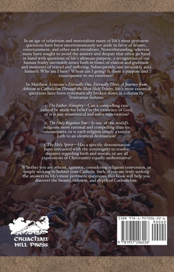 In an age of relativism and materialism many of life’s most pertinent questions have been unceremoniously set aside in favor of the trivialities of leisure and entertainment. Notwithstanding, whereas many have sought to avoid the anxiety and despair that often go hand in hand with questions of life’s ultimate purpose, a recognition of our human frailty inevitably arises both in times of elation and gratitude and moments of travail and suffering. Subsequently, one invariably asks himself: Why am I here? Where am I going? Is there a purpose and consequence to my existence? In Matthew Aristone's Eternally One, Eternally Three: A Journey from Atheism to Catholicism Through the Most Holy Trinity, life’s most essential questions have been systematically broken down in a distinctly Trinitarian fashion: