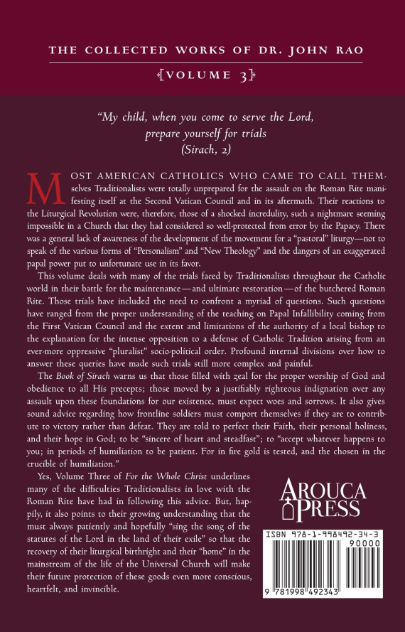 Most American Catholics who came to call themselves Traditionalists were totally unprepared for the assault on the Roman Rite manifesting itself at the Second Vatican Council and in its aftermath. Their reactions to the Liturgical Revolution were, therefore, those of a shocked incredulity, such a nightmare seeming impossible in a Church that they had considered so well-protected from error by the Papacy. There was a general lack of awareness of the development of the movement for a “pastoral” liturgy—not to speak of the various forms of “Personalism” and “New Theology” and the dangers of an exaggerated papal power put to unfortunate use in its favor. This volume deals with many of the trials faced by Traditionalists throughout the Catholic world in their battle for the maintenance—and ultimate restoration—of the butchered Roman Rite. Those trials have included the need to confront a myriad of questions. Such questions have ranged from the proper understanding of the teaching on Papal Infallibility coming from the First Vatican Council and the extent and limitations of the authority of a local bishop to the explanation for the intense opposition to a defense of Catholic Tradition arising from an ever-more oppressive “pluralist” socio-political order. Profound internal divisions over how to answer these queries have made such trials still more complex and painful.  The Book of Sirach warns us that those filled with zeal for the proper worship of God and obedience to all His precepts; those moved by a justifiably righteous indignation over any assault upon these foundations for our existence, must expect woes and sorrows. It also gives sound advice regarding how frontline soldiers must comport themselves if they are to contribute to victory rather than defeat. They are told to perfect their Faith, their personal holiness, and their hope in God; to be “sincere of heart and steadfast”; to “accept whatever happens to you; in periods of humiliation to be patient. For in fire gold is tested, and the chosen in the crucible of humiliation.”  Yes, Volume Three of For the Whole Christ underlines many of the difficulties Traditionalists in love with the Roman Rite have had in following this advice. But, happily, it also points to their growing understanding that the must always patiently and hopefully “sing the song of the statutes of the Lord in the land of their exile” so that the recovery of their liturgical birthright and their “home” in the mainstream of the life of the Universal Church will make their future protection of these goods even more conscious, heartfelt, and invincible.