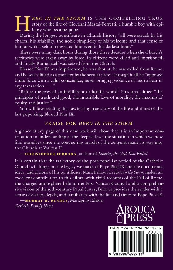 There is no doubt in my mind that the path forward for Catholics in the post-conciliar era demands a thorough understanding of the pontificate and legacy of Pope Pius IX. One simply cannot grasp the significance of calling the documents of Vatican-II a “counter-Syllabus” without first understanding the impetus behind the Syllabus of Errors itself, nor can one make sense of the Revolution of today without first placing it within the broader context of the Revolution of the tumultuous 19th century. It is certain that the trajectory of the post-conciliar period of the Catholic Church will hinge on the legacy we make of Pope Pius IX and the documents, ideas, and actions of his pontificate. Mark Fellows in Hero in the Storm makes an excellent contribution to this effort, with vivid accounts of the Fall of Rome, the charged atmosphere behind the First Vatican Council and a comprehensive vision of the 19th-century Papal States, Fellows provides the reader with a sense of clarity, depth, and familiarity with the life and times of Pope Pius IX. —Murray W. Rundus, Managing Editor, Catholic Family News