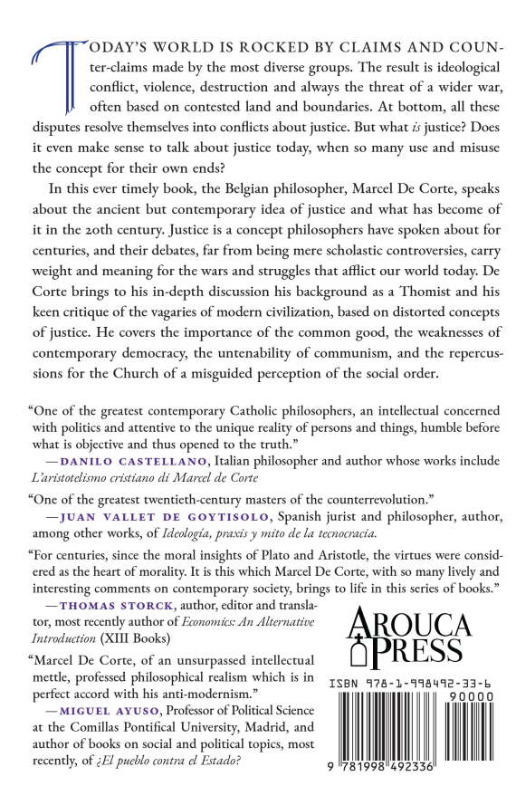 Today's world is rocked by claims and counter-claims made by the most diverse groups. The result is ideological conflict, violence, destruction and always the threat of a wider war, often based on contested land and boundaries. At bottom, all these disputes resolve themselves into conflicts about justice. But what is justice? Does it even make sense to talk about justice today, when so many use and misuse the concept for their own ends? In this ever timely book, the Belgian philosopher, Marcel De Corte, speaks about the ancient but contemporary idea of justice and what has become of it in the 20th century. Justice is a concept philosophers have spoken about for centuries, and their debates, far from being mere scholastic controversies, carry weight and meaning for the wars and struggles that afflict our world today. De Corte brings to his in-depth discussion his background as a Thomist and his keen critique of the vagaries of modern civilization, based on distorted concepts of justice. He covers the importance of the common good, the weaknesses of contemporary democracy, the untenability of communism, and the repercussions for the Church of a misguided perception of the social order.