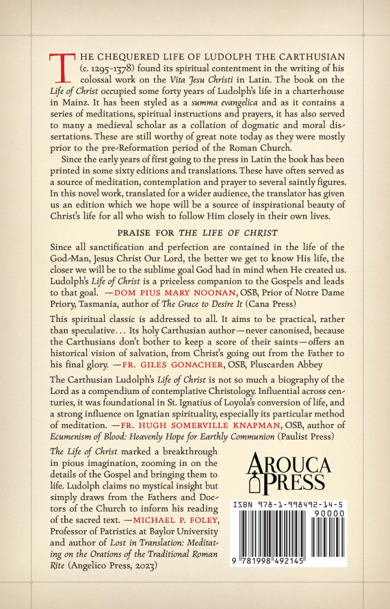 •  Since all sanctification and perfection are contained in the life of the God-Man, Jesus Christ Our Lord, the better we get to know His life, the closer we will be to the sublime goal God had in mind when He created us. Ludolph’s Life of Christ is a priceless companion to the Gospels and leads to that goal. —Dom Pius Mary Noonan, O.S.B., Prior of Notre Dame Priory, Tasmania, author of Fig Leaves Are Not Enough, Whilst It Is Day, The Grace to Desire It and Divine Providence and Human Freedom (Cana Press)