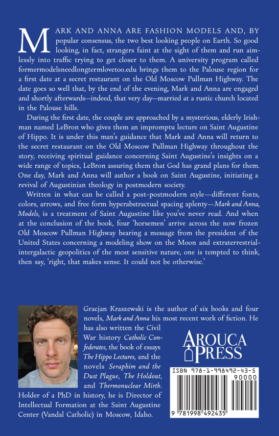 Written in what can be called a post-postmodern style—different fonts, colors, arrows, and free form hyperabstractual spacing aplenty—Mark and Anna, Models, is a treatment of Saint Augustine like you’ve never read. And when at the conclusion of the book, four ‘horsemen’ arrive across the now frozen Old Moscow Pullman Highway bearing a message from the president of the United States concerning a modeling show on the Moon and extraterrestrial-intergalactic geopolitics of the most sensitive nature, one is tempted to think, then say, ‘right, that makes sense. It could not be otherwise.’