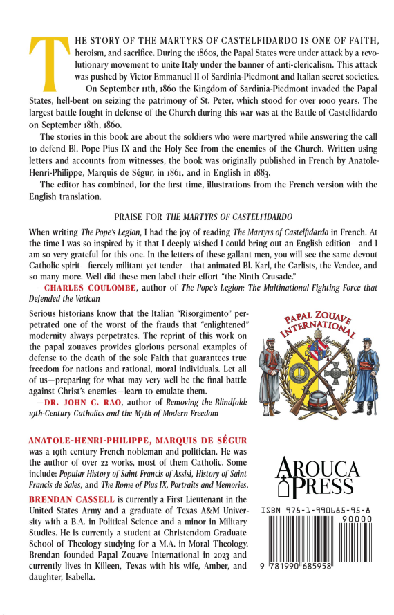 The story of the Martyrs of Castelfidardo is one of faith, heroism, and sacrifice. During the 1860s, the Papal States were under attack by a revolutionary movement to unite Italy under the banner of anti-clericalism. This attack was pushed by Victor Emmanuel II of Sardinia-Piedmont and Italian secret societies. On September 11th, 1860 the Kingdom of Sardinia-Piedmont invaded the Papal States, hellbent on seizing the patrimony of St. Peter, which stood for over 1000 years. The largest battle fought in defense of the Church during this war was at the Battle of Castelfidardo on September 18th, 1860. The compilation of stores in this book are about the soldiers who were martyred while answering the call to defend Bl. Pope Pius IX and the Holy See from the enemies of the Church. Written using letters and accounts from witnesses, the book was originally published in French by Anatole-Henri-Philippe, Marquis de Ségur in 1861, and in English in 1883. The editor has combined, for the first time, illustrations from the French version with the English translation.