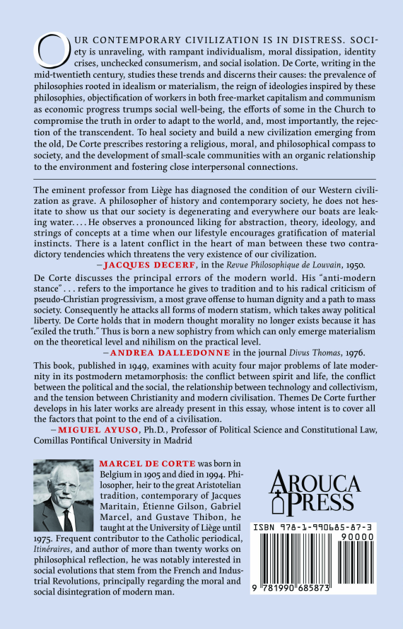 • Our contemporary civilization is in distress. Society is unraveling, with rampant individualism, moral dissipation, identity crises, unchecked consumerism, and social isolation. De Corte, writing in the mid-twentieth century, studies these trends and discerns their causes: the prevalence of philosophies rooted in idealism or materialism, the reign of ideologies inspired by these philosophies, objectification of workers in both free-market capitalism and communism as economic progress trumps social well-being, the efforts of some in the Church to compromise the truth in order to adapt to the world, and, most importantly, the rejection of the transcendent. To heal society and build a new civilization emerging from the old, De Corte prescribes restoring a religious, moral, and philosophical compass to society, and the development of small-scale communities with an organic relationship to the environment and fostering close interpersonal connections.