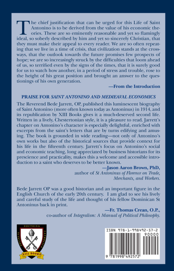 • The Reverend Bede Jarrett, OP, published this luminescent biography of Saint Antonino (more often known today as Antoninus) in 1914, and its republication by XIII Books gives it a much-deserved second life. Written in a lively, Chestertonian style, it is a pleasure to read. Jarrett’s chapter on Antonino’s character is especially delightful, enriched with excerpts from the saint’s letters that are by turns edifying and amusing. The book is grounded in wide reading—not only of Antonino’s own works but also of the historical sources that provide context for his life in the fifteenth century. Jarrett’s focus on Antonino’s social and economic teaching, long appreciated by business historians for its prescience and practicality, makes this a welcome and accessible introduction to a saint who deserves to be better known. —Jason Aaron Brown, PhD, author of St Antoninus of Florence on Trade, Merchants, and Workers.