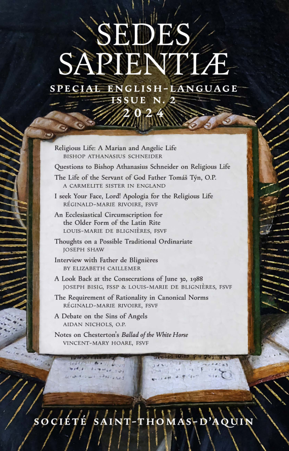 In this second English-language issue of Sedes Sapientiæ, two prominent themes emerge. First, Fr. de Blignières and Joseph Shaw debate the feasibility of establishing an “ordinariate,” i.e., a canonical structure with a bishop, to harbor traditional Catholics. This constructive solution to the current predicament of traditionalists stands in contrast to critical or defensive postures that “custodians of Tradition” have generally been constrained to adopt. Bishop Athanasius Schneider broaches the second principal theme of this issue, the religious life, with his personal testimony as a canon regular, which is complemented by a captivating portrait of the late Dominican friar, Fr. Tomáš Týn, by a Carmelite Sister.