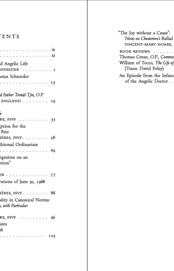 Fr. Aidan Nichols, O. P., introduces the reader to a sharp discussion among Thomists on the sins of the angels. Noteworthy, too, is the somber reflection on Archbishop Lefebvre’s 1988 consecrations co-written by two founders of Ecclesia Dei communities, as well as Fr. Reginald Rivoire’s Thomistic exposition of “rationality” in canon law, which follows up on his highly acclaimed canonical analysis of Traditionis custodes. On a lighter note, the reader may alight upon an English lay-brother’s whimsical commentary on the greatest of Chesterton’s poems, or a review and chapter of the first English translation of the most ancient biography of St. Thomas Aquinas.