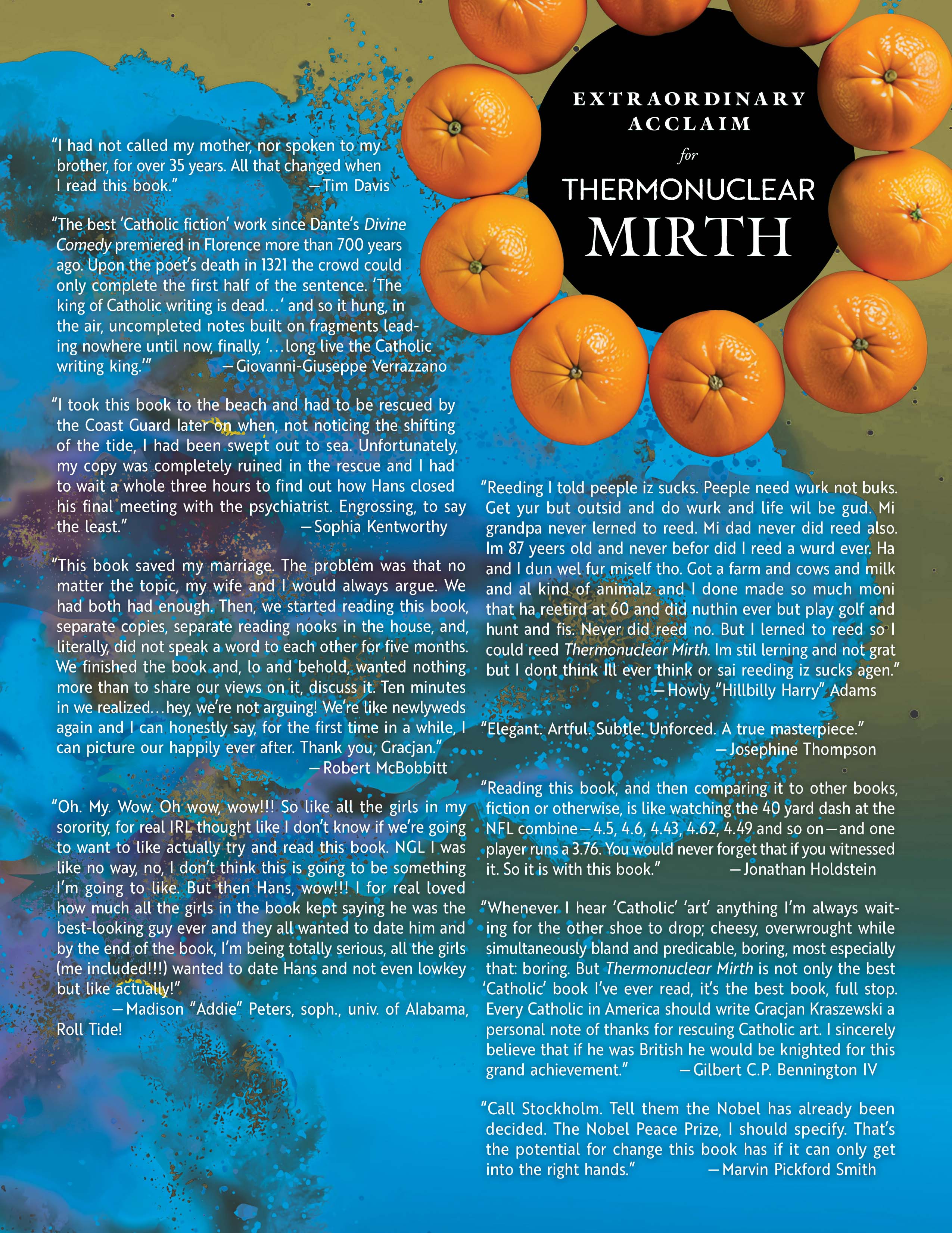 Ben graduates from ESSNWNAU-AL and sets out on a veritable odyssey of job seeking under the guidance of his atheistic, bombastic, profane and impossibly handsome ‘job coach’ Hans, as they globetrot from New Mexico to Mississippi to Boise to Europe and back. All the while, and purposely put into a parallel narrative in the footnotes, the wannabe president constructs his evil schemes. After nine hundred pages of a journey equal parts theological, philosophical, comedic, tragic, maximal and absurd, disparate roads converge back in New Mexico, back with the Franklin family, back at ESSNWNAU-AL, with the revelation of Schliemann’s actual reason for founding the school, his connection to the Franklins, the threat of an A.I. induced apocalyptic holocaust, and a Catholic prelate, the Archbishop of the Coastal Mountain West, he simultaneously ‘His Serene Nuclear Highness,’ possessing a singular button and a lonely, but perhaps necessary, choice, one, nonetheless, that contains within it the possibility of eliminating all future possibilities. * * * * * The book is at times sincere, at times absurd, at times extremely absurd; it will make you cry, laugh until you cry, inspire you to learn at least one foreign language, and make you feel guilty, and ashamed, if you cannot do ten pull-ups, jump up and touch 9 feet, and run a respectable mile; it is at times profane, vulgar, and base, (+18 readership) but, unlike scores of books for whom those markers are the goal as well, here such things are only present so as to show the horrid reality of sin so as to lead readers to a clearer, and long lasting, appreciation of the narrow path towards the Good, the True, the Beautiful. The “reality of sin;” so too the reality of beer, politics at Thanksgiving dinner, Rottweilers, Lake Zurich, Rhode Island Red Hens, ad infinitum. This because Thermonuclear Mirth is a book about real life; the messiness of it, yes, down to the very bottom of the well; but the hope, rather the surety, of solutions to the messiness and a path to authentic happiness. The book is for readers 18+ (strong language included) -